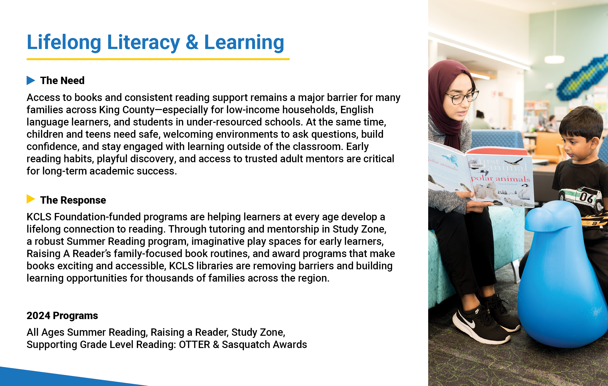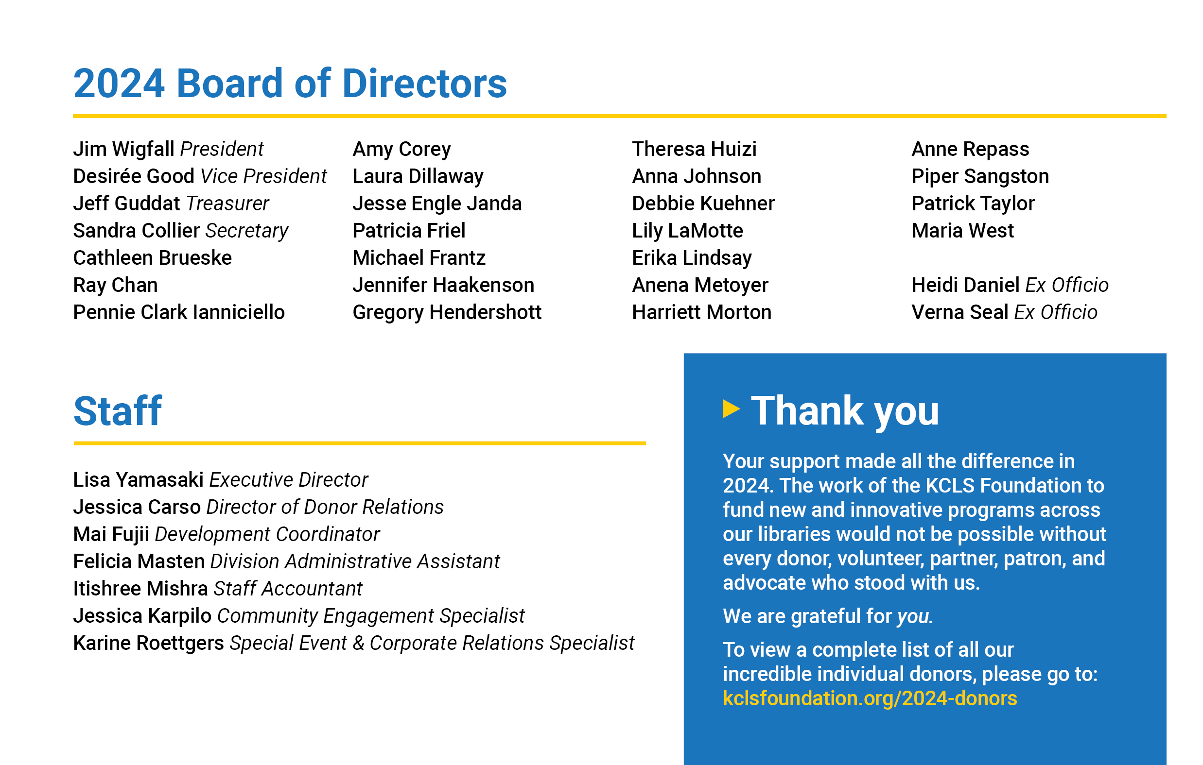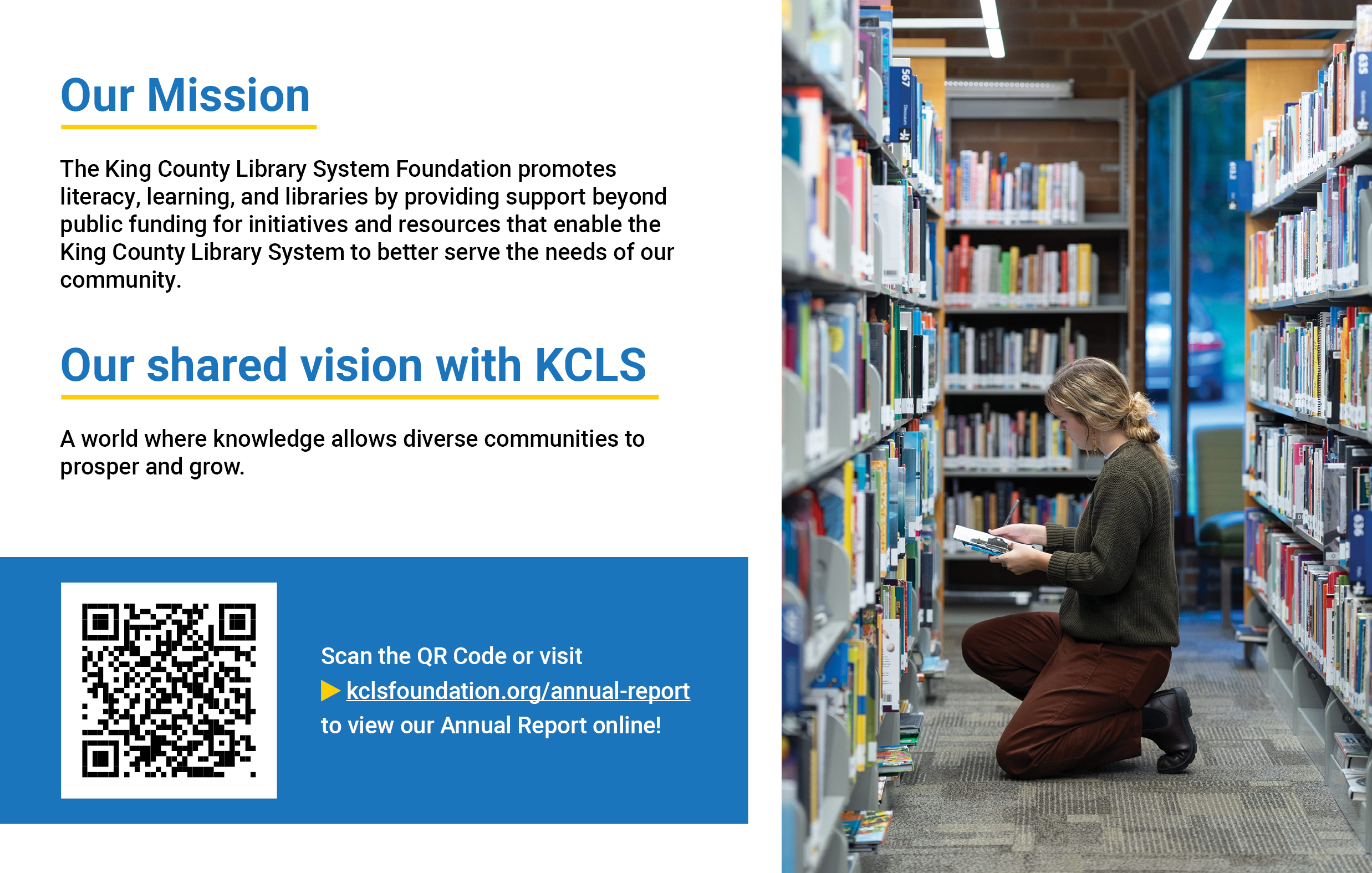 The KCLS Foundation’s Annual Report offers a snapshot of the impact our donors made possible in 2024. Inside, you’ll find financial highlights, funding priorities, and key program outcomes that show how community support helps libraries innovate, grow, and reach more people every year.